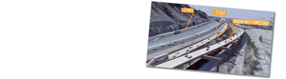 The Border West Expressway is located west of downtown El Paso and south of I-10. It extends approximately 7.4 miles from Racetrack Drive near Doniphan Road and New Mexico 273 East to US 54, one mile east of Park Street. In addition to adding more lane miles for drivers in the area, the project will also improve access to UTEP, downtown destinations, border crossings/international bridges and medical centers.